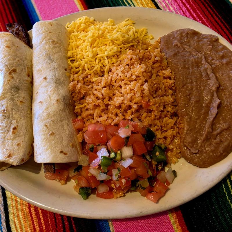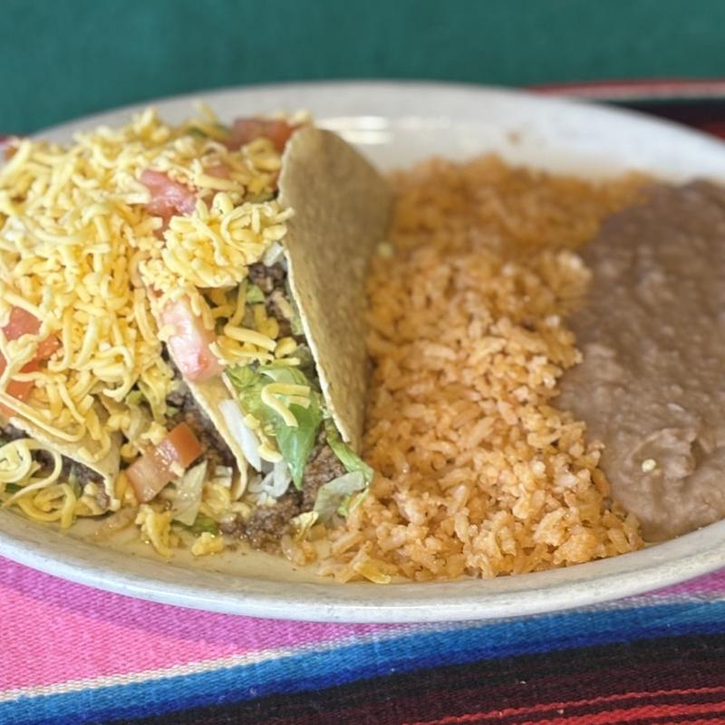 Three crispy tacos filled with beef, pork or chicken served with rice & beans.