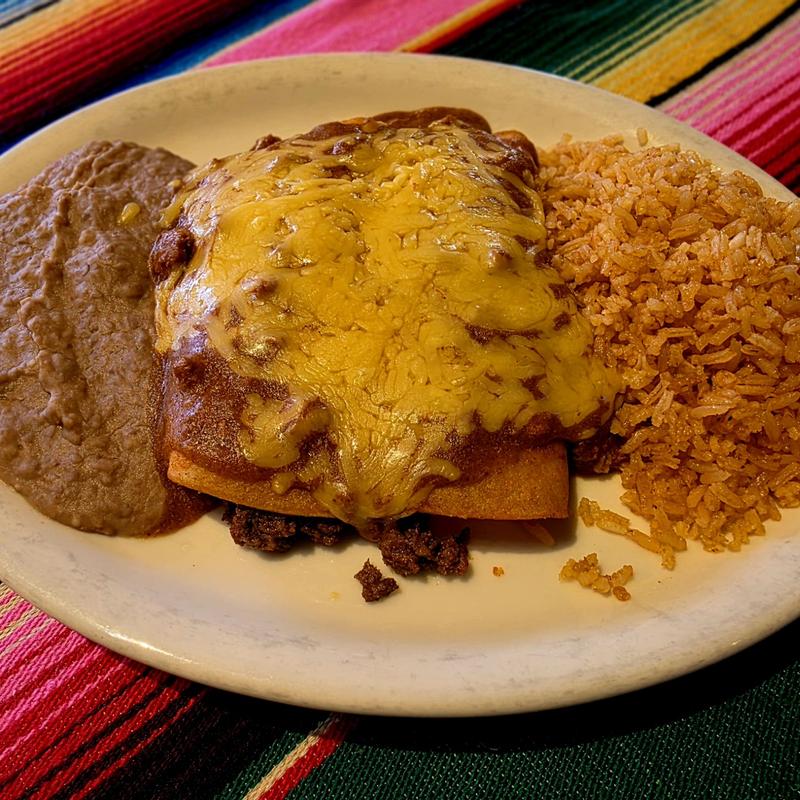 Two beef enchiladas, topped with cheese & meat sauce, served with rice & beans.