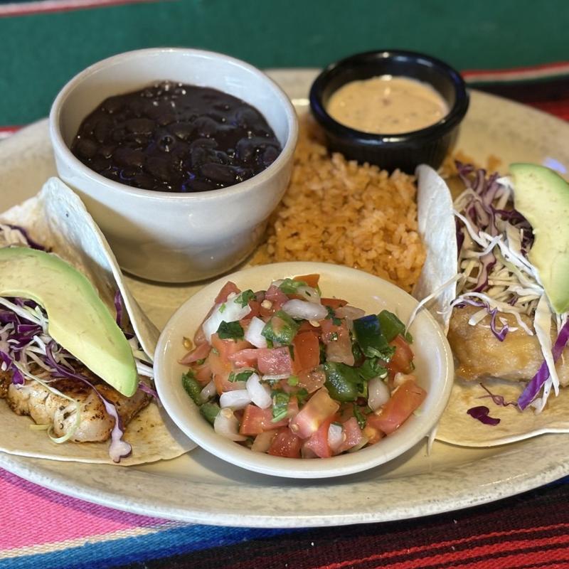 Two chicken fajita or pork tacos with cheese, pico de gallo, rice & beans.