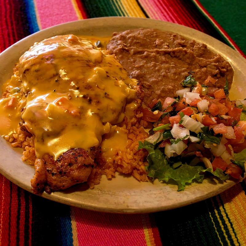 Grilled chicken breast over rice, topped with queso & pico served with beans.