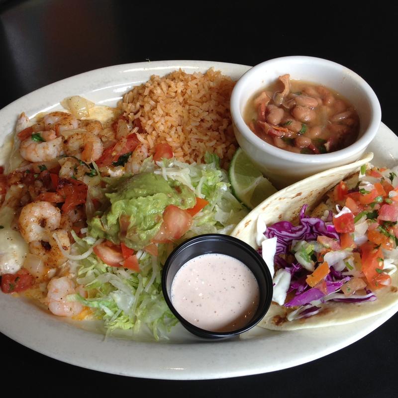Two enchiladas topped with shrimp, tomatoes, onions, garlic sour cream sauce & cheese, one grilled or fried tilapia taco, served with chipotle ranch, fresh limes, guacamole salad.