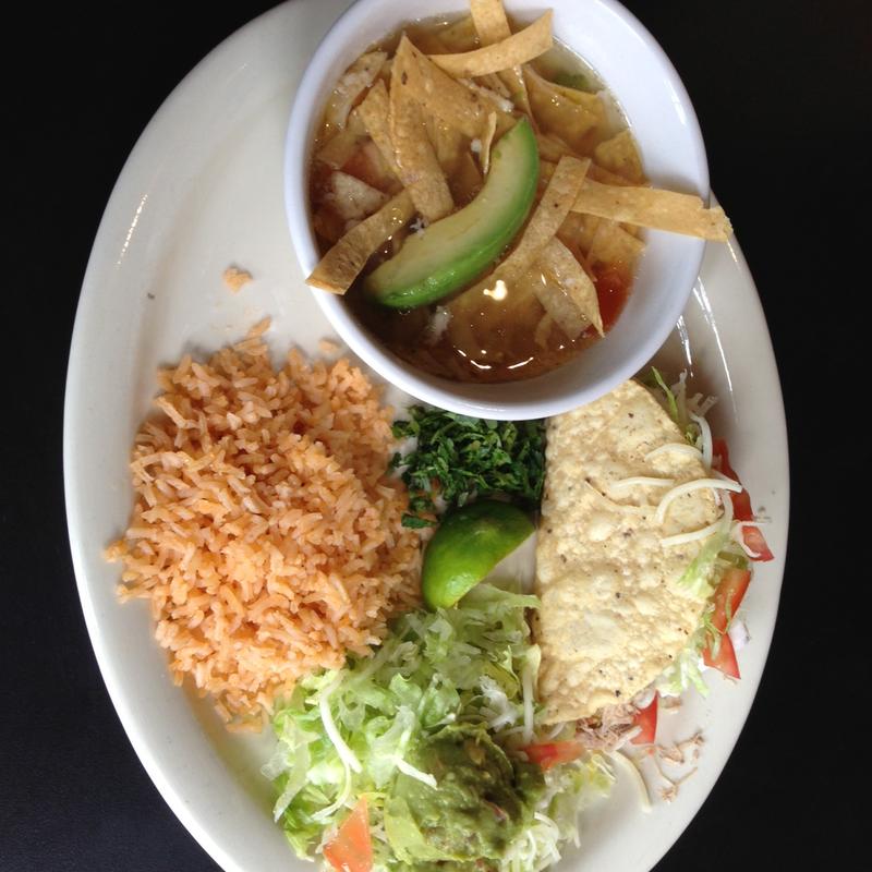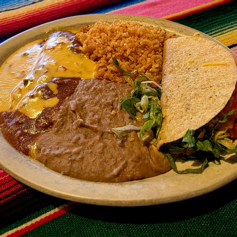 Chile con queso, one crispy taco, guacamole salad & two beef or cheese enchiladas.