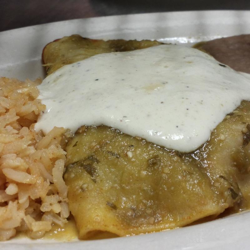 Your Choice Of Beef, Cheese, Or Chicken, Or Spinach & Mushrooms, Enchiladas (2) With Your Choice Of Sauce: Verde, Ranchera, Chile Con Carne, Adobo, Or Garlic Cream Sauce. Served With Mexican Rice, Choice Of Beans, Chips & Salsa