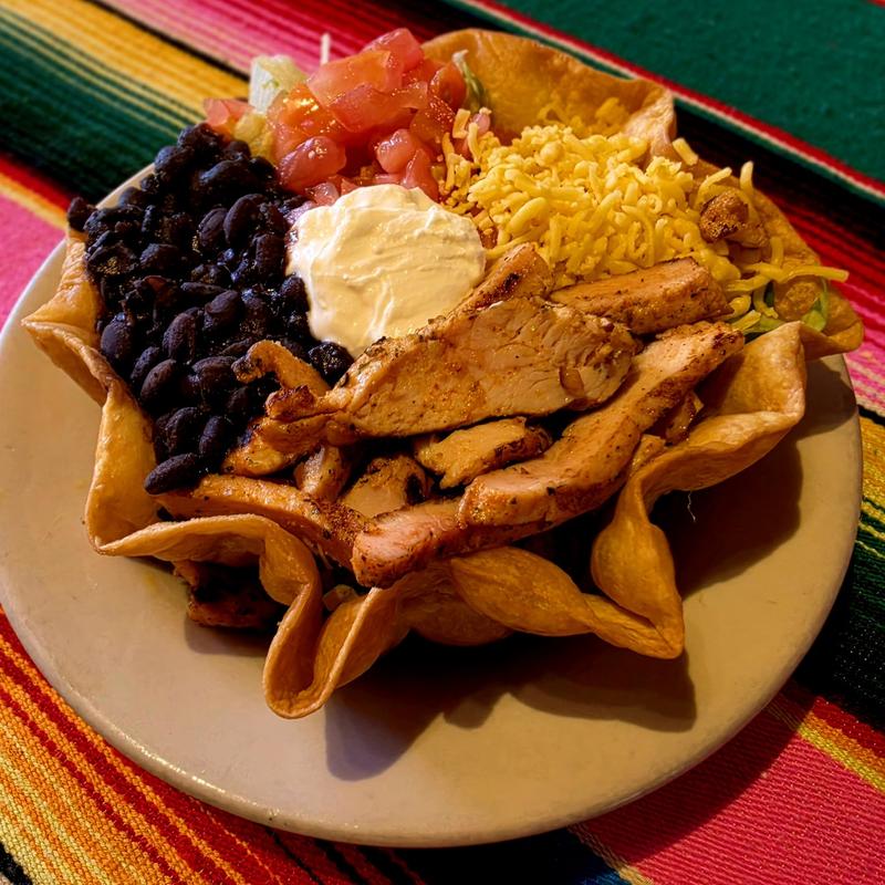 Chicken fajita salad with cheese, lettuce, tomatoes, black beans & sour cream.