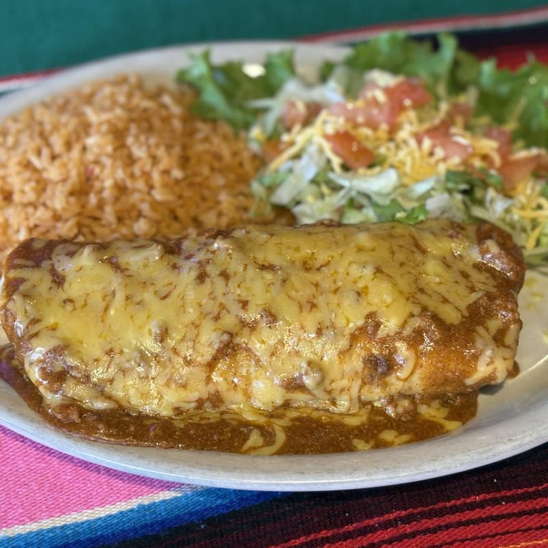 Large flour tortilla stuffed with ground beef and beans, topped with chile con carne & cheese, with rice, lettuce & tomatoes, fajita beef, chicken or brisket.