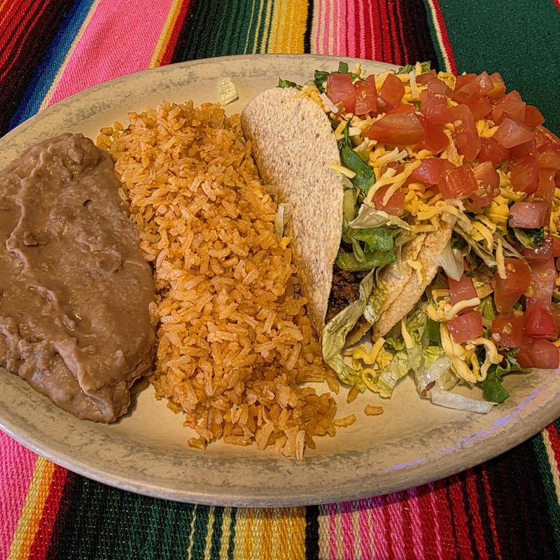 One crispy beef taco, one cheese enchilada topped with queso & meat sauce, rice & beans.
