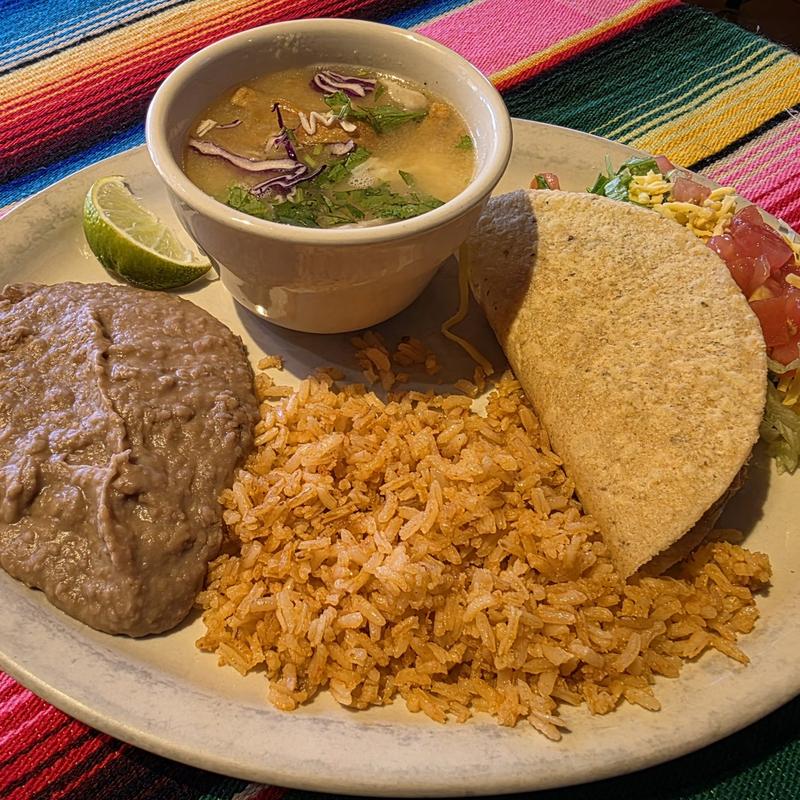 A cup of tortilla soup, one chicken taco, rice & beans.