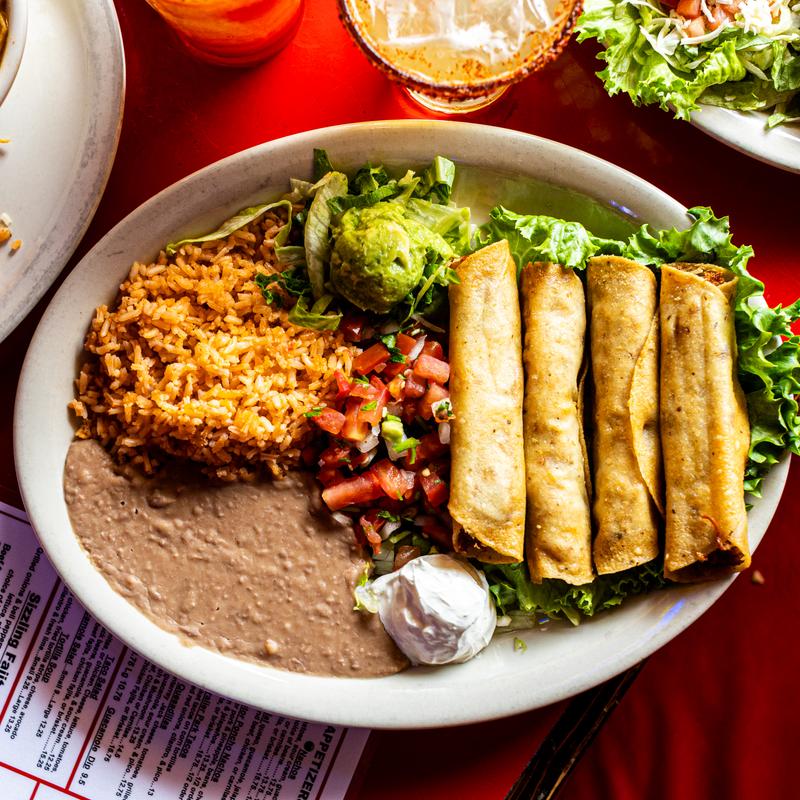 (4) Seasoned chicken rolled in corn tortillas, fried crispy, with sour cream, pico de gallo, guacamole.