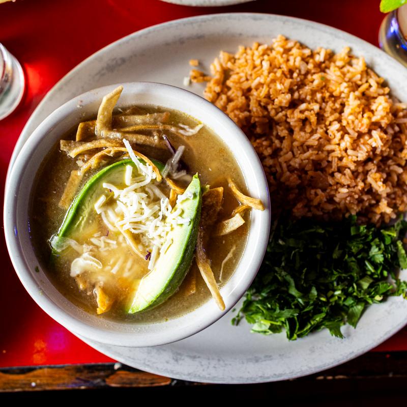 Chicken soup, with tortillas strips, cheese, & avocado, with rice • Small | Large