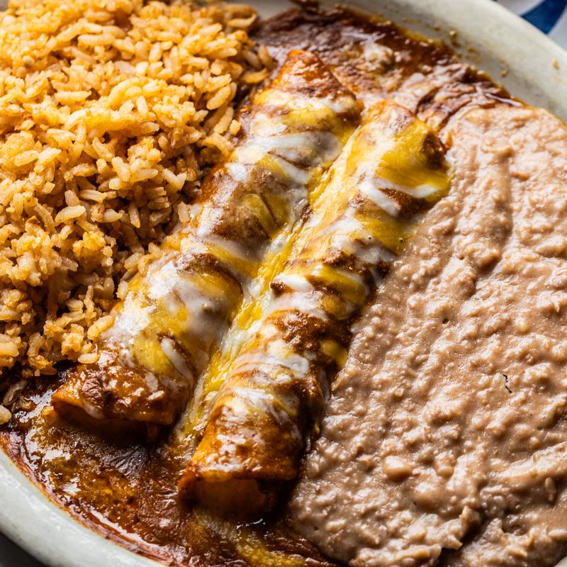 Two cheese enchiladas, topped with Tex-Mex chili meat sauce & queso, rice & beans.