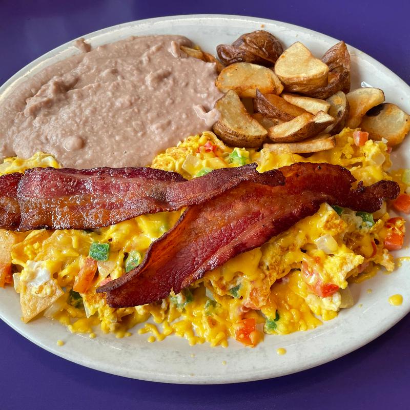 Two eggs, mixed with tomatoes, onions, peppers, cheese & corn tortilla strips, bacon or sausage.