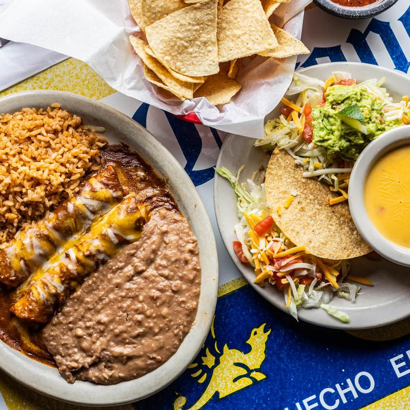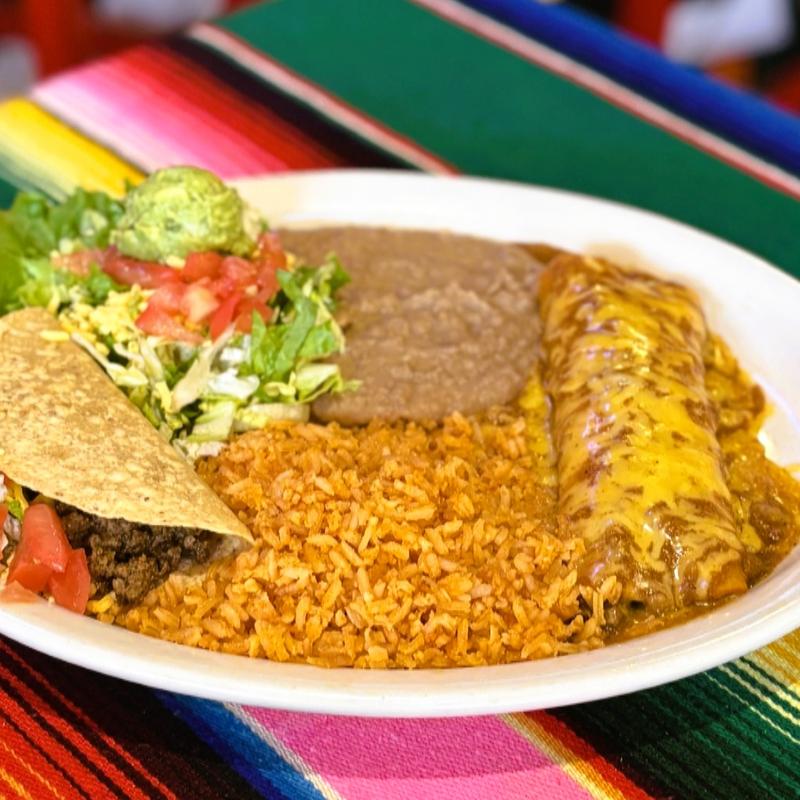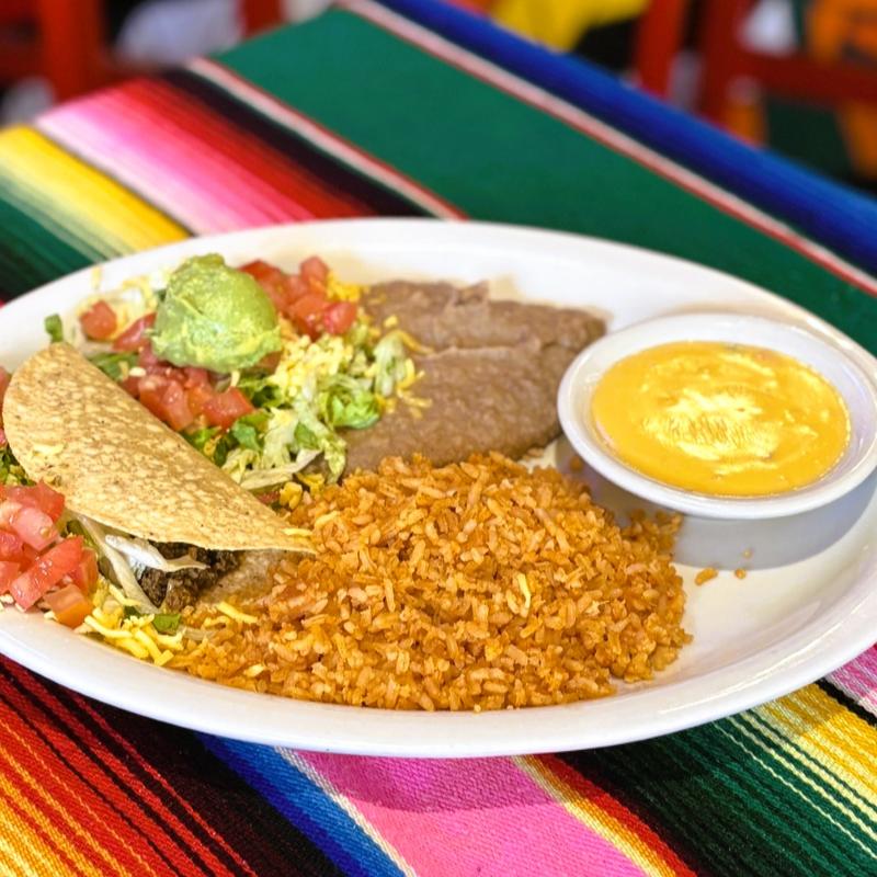 Chile con queso, one crispy taco, guacamole salad & two beef or cheese enchiladas.