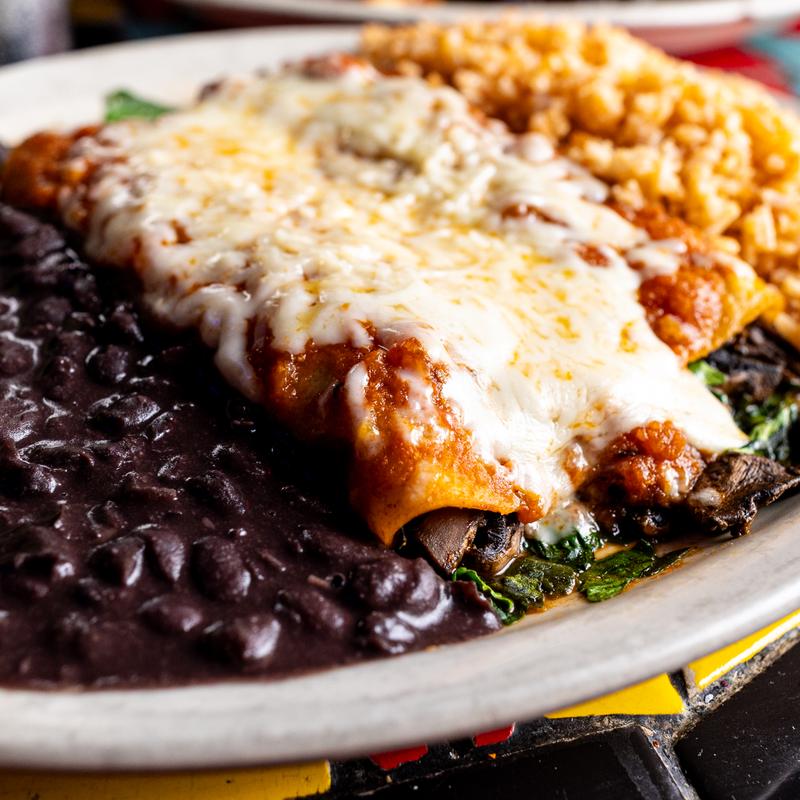 Enchiladas stuffed with sautéed mushrooms & spinach topped with salsa ranchera & white cheese, served with black beans & rice.