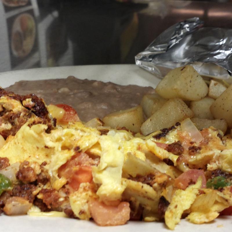 Two egg tacos & your choice of two item, potato, beans, bacon, sausage or cheese.