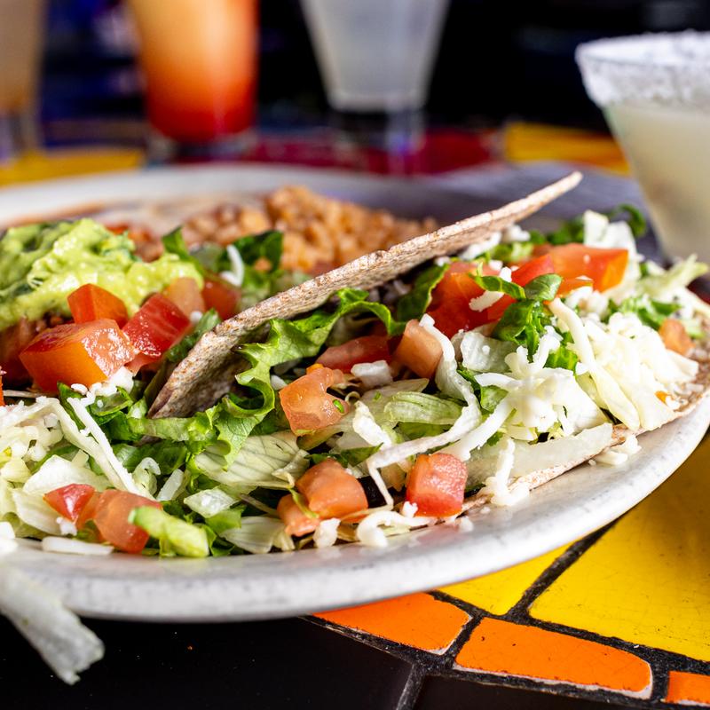 Three crispy tacos filled with beef, pork or chicken served with rice & beans.