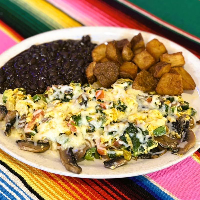 Two eggs, with mushrooms, spinach, tomatoes, onions, peppers & cheese, with black beans.