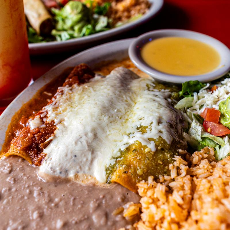 Your Choice Of Beef, Cheese, Or Chicken, Or Spinach & Mushrooms, Enchiladas (2) With Your Choice Of Sauce: Verde, Ranchera, Chile Con Carne, Adobo, Or Garlic Cream Sauce. Served With Mexican Rice, Choice Of Beans, Chips & Salsa