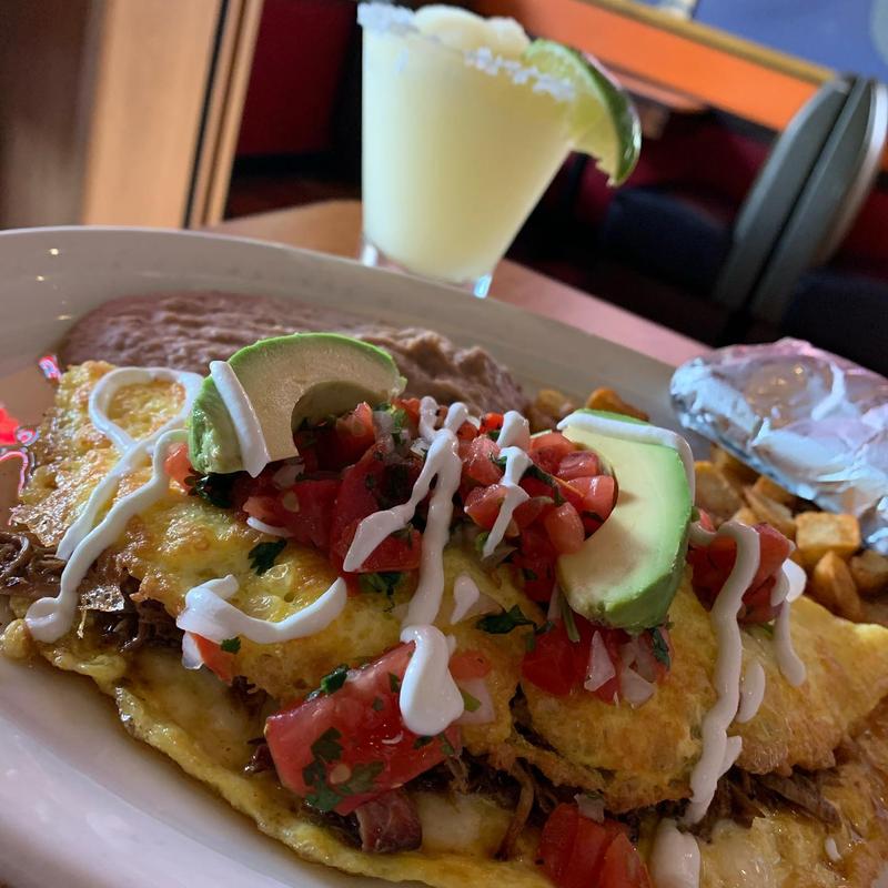 Three egg omelette filled with smoked braised pork in a mild roasted poblano green sauce & cheese, topped with pico de gallo, sour cream & sliced avocado.